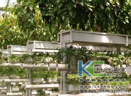 頂部使用基質槽栽培果菜,下部使用管道水耕栽培種植葉菜,是常見的混合型無土栽培技術模式之一,主要應用于觀光展示型無土栽培農業。
