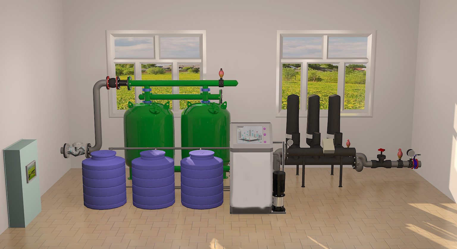 為了管理和操作方便,噴灌系統(tǒng)中常將控制器、電器設(shè)備、過濾器、壓力表、排氣閥、逆止閥和施肥設(shè)備等集中安裝在整個(gè)噴灌系統(tǒng)的開始部分,故稱為首都裝置。而把除首部裝置以外的其他位于田間的所有裝置包括管道、控制閥、支管、豎管、噴頭等稱為田間系統(tǒng)。